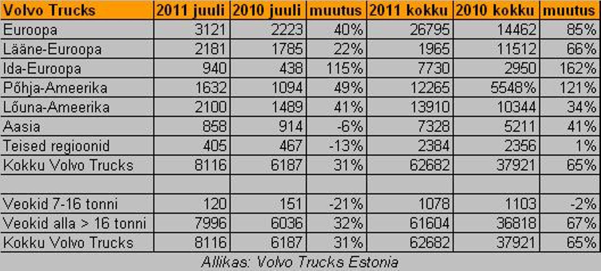 Volvo veokeid tarniti juulis 31 protsenti enam võrreldes 2010. aasta sama perioodiga. Tarned kasvasid kõikides suuremates regioonides, kuid kõige suurem kasv on tarnetes Venemaale.