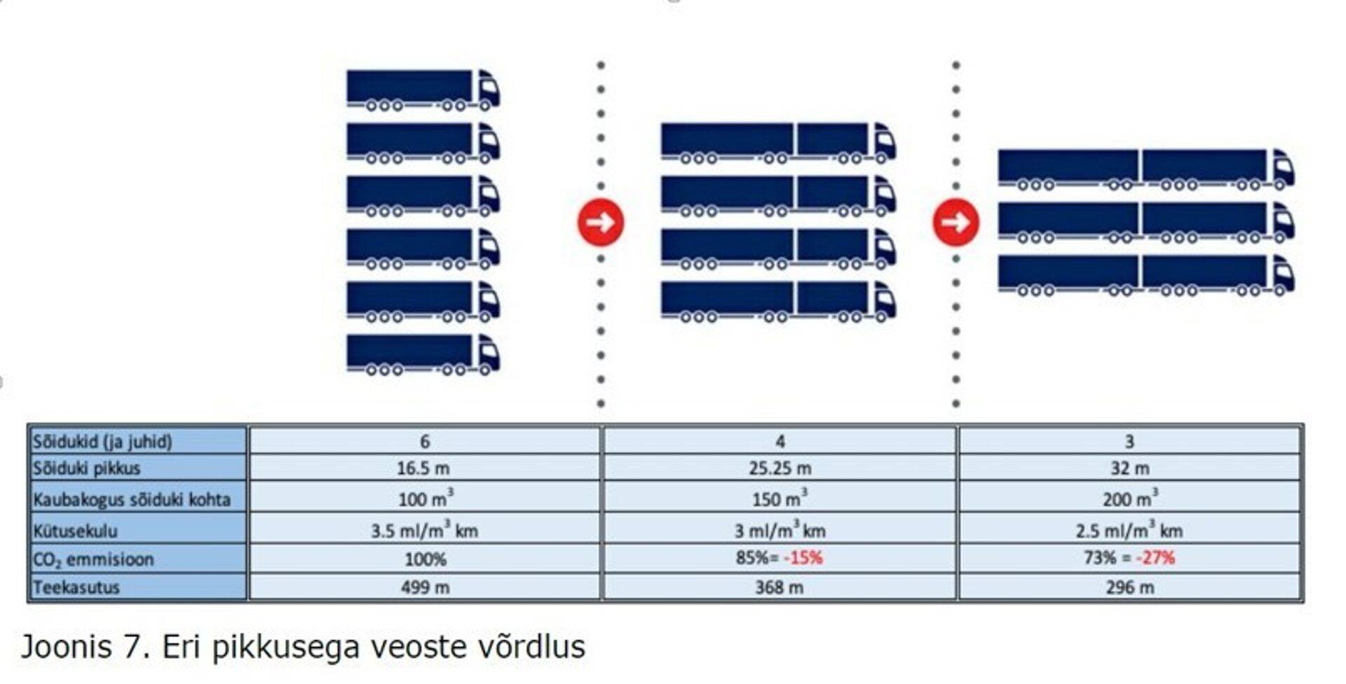 Kitsing märgib, et esmapilgul võib tunduda, et raskemad veokid teevad rohkem kahju, kuid tegelikult on muudes riikides ja eelkõige Skandinaaviast saadud kogemus näidanud, et efekt on vastupidine. „Esiteks ei tähenda raskem veoki kogukaal suuremat survet teele, sest kaal jaguneb laiali rohkemate telgede vahel. Kõige olulisem on aga see, et pikemad autorongid mahutavad 30-40% rohkem kaupa ehk 36 euroaluse asemel 51 alust. See tähendab, et näiteks kolm veokitäit kaupa saab ära vedada vaid kahe veokiga,“ märkis Kitsing.